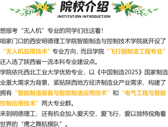 西安地区更是飞机制造业的密集区,有西飞和陕飞两大著名飞机制造商,有蒲城国际通用航空展,有西北工业大学的航空学院等很多科研院所,有众多的无人机研制单位等。他们都等待你的加入,从明德学院的“飞行器制造工程专业”出发,你就可以圆你的飞机梦,圆你的大学梦和人生梦。