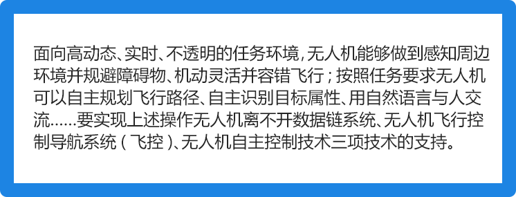 面向高动态、实时、不透明的任务环境,无人机能够做到感知周边环境并规避障碍物、机动灵活并容错飞行;按照任务要求无人机可以自主规划飞行路径、自主识别目标属性、用自然语言与人交流……要实现上述操作无人机离不开数据链系统、无人机飞行控制导航系统(飞控)、无人机自主控制技术三项技术的支持。